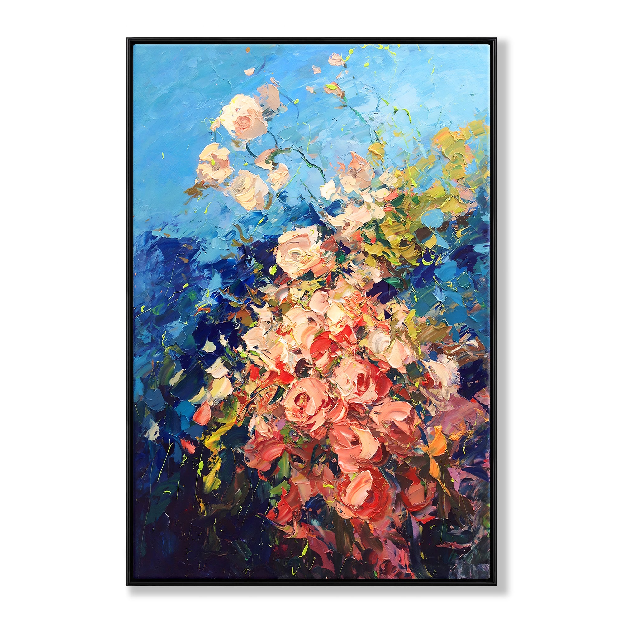 This painting shows bright, colorful flowers that look like they're sinking. It's painted in a soft, impressionistic style, giving a sad but beautiful feeling to the scene. This melancholic composition enhances every space or room!