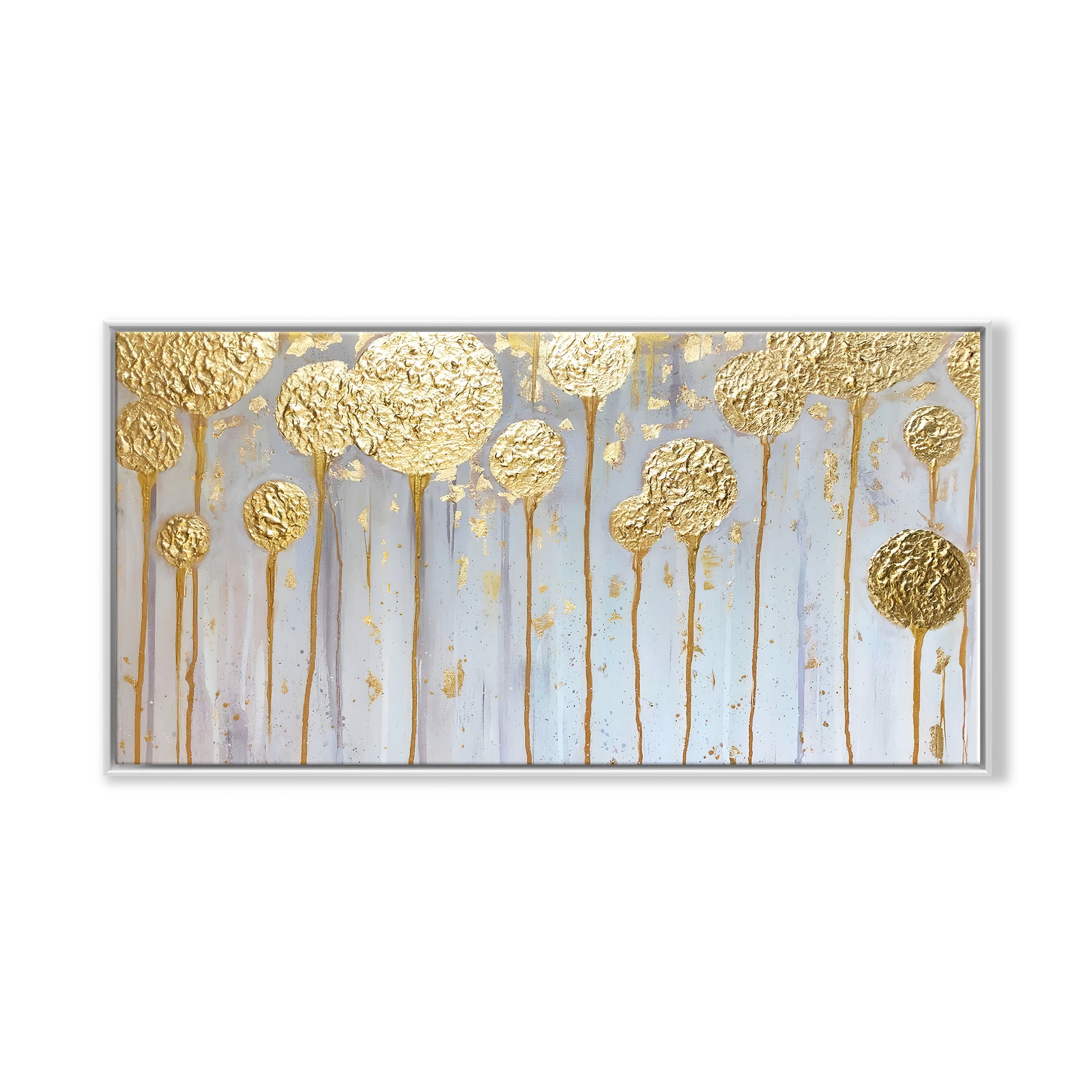 In this artwork, the golden dahlias take on a mesmerizing quality with their thick petals and slender stems. The large golden buds seem to capture the essence of nature's perfection, creating a harmonious and captivating composition.