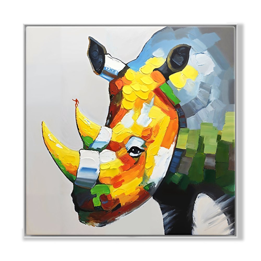 We'd like to introduce to you: Leopold, the mighty rhyno! Shy as he is, he still wants to show of his special horns, which he is very proud of! Despite abstractly painted shapes with unusual colors, Leopold still comes alive in this artwork!⁠