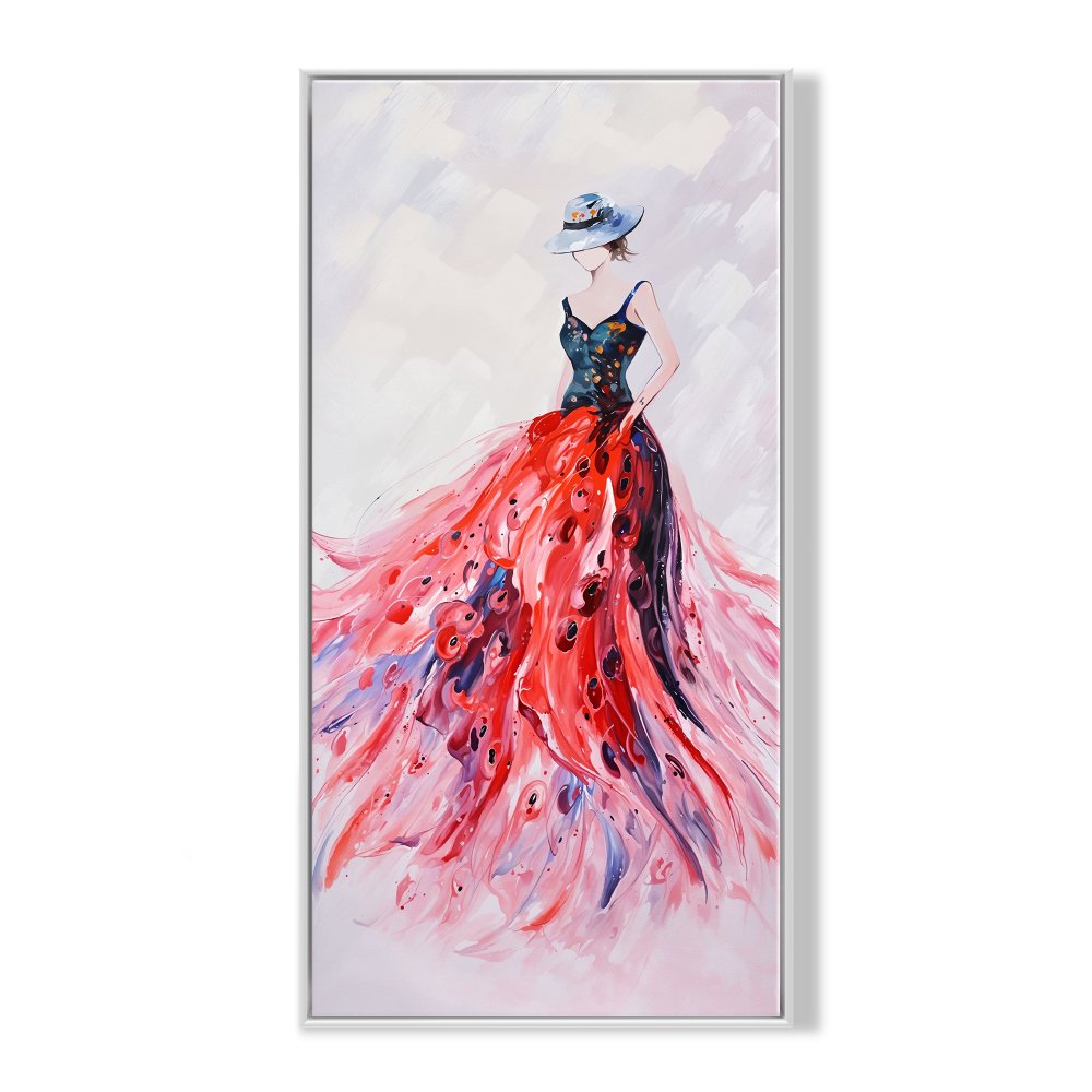 This painting portrays a lady in a remarkable red dress that resembles the elegance of peacock feathers. The dress has a lot of intricate details and vibrant colors, creating a mesmerizing effect. The lady stands tall and confident, embodying the beauty and allure of the red dress.